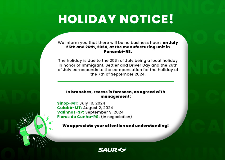 We inform that on February 28th there will be no workday at SAUR in Panambi/RS due to the Municipality Day. It will be a normal day at SAUR other units.Thank you for understanding!