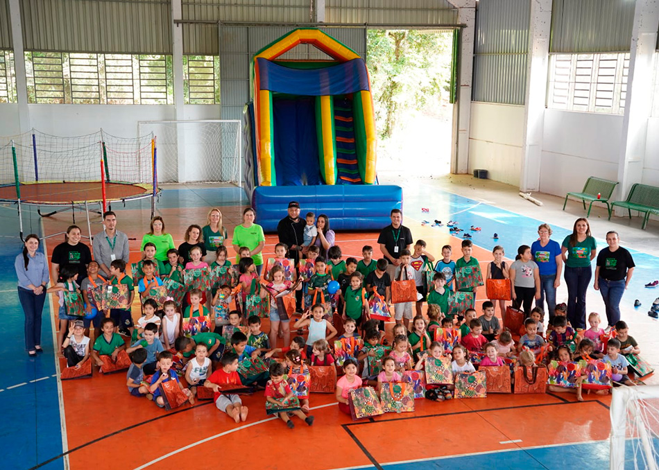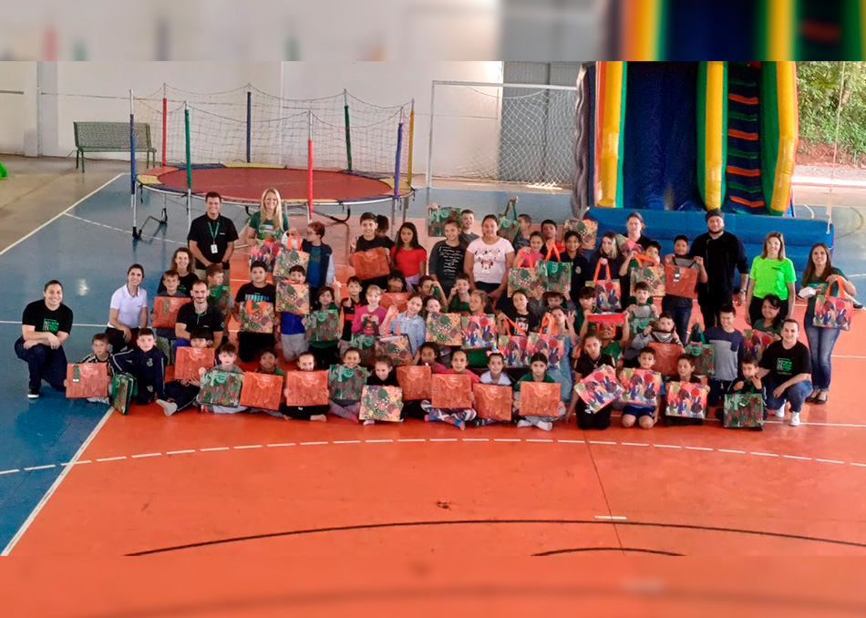 A programação contou ainda com a participação dos voluntários da empresa que interagiram com os alunos e auxiliaram na entrega do lanche e do presente.