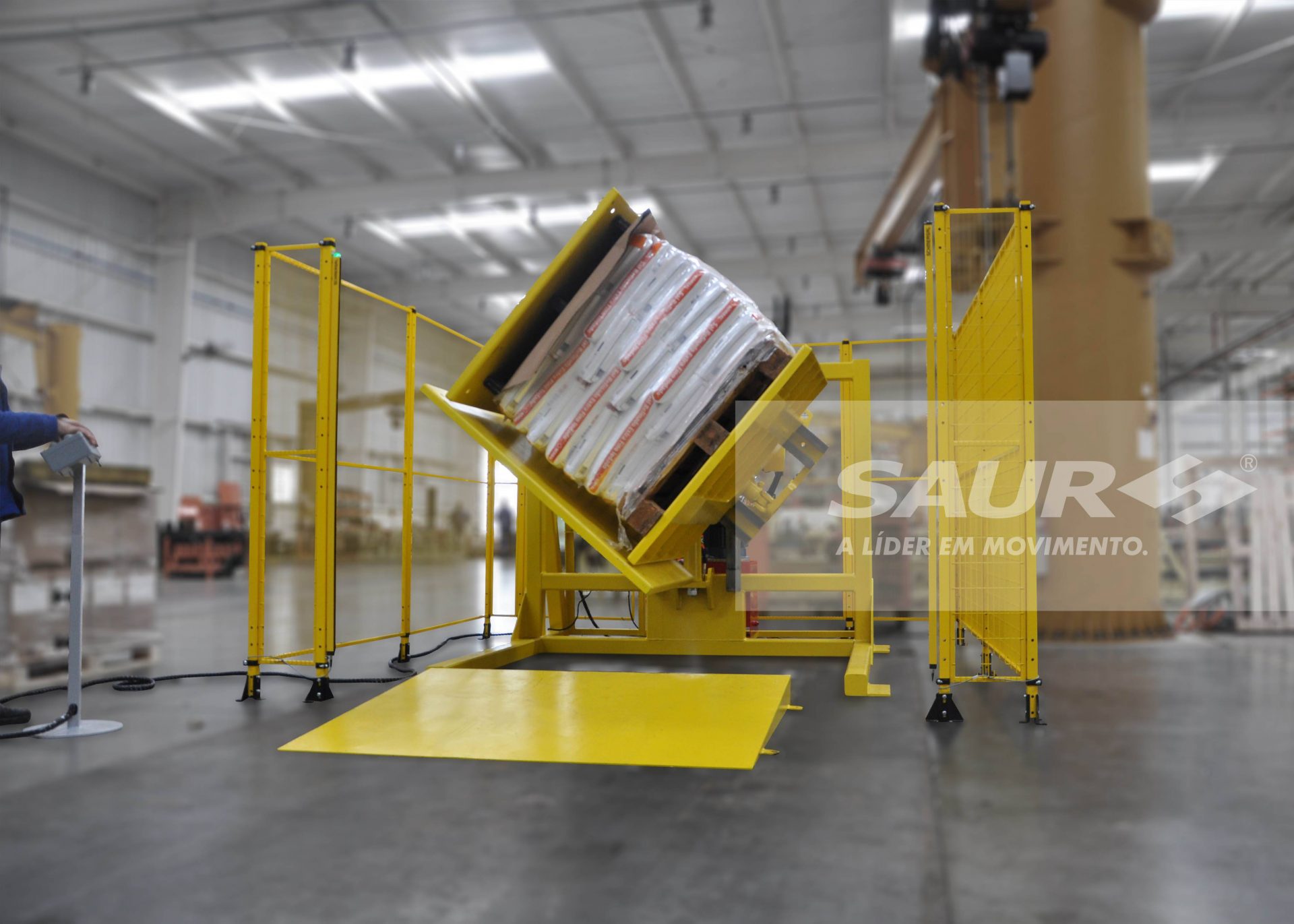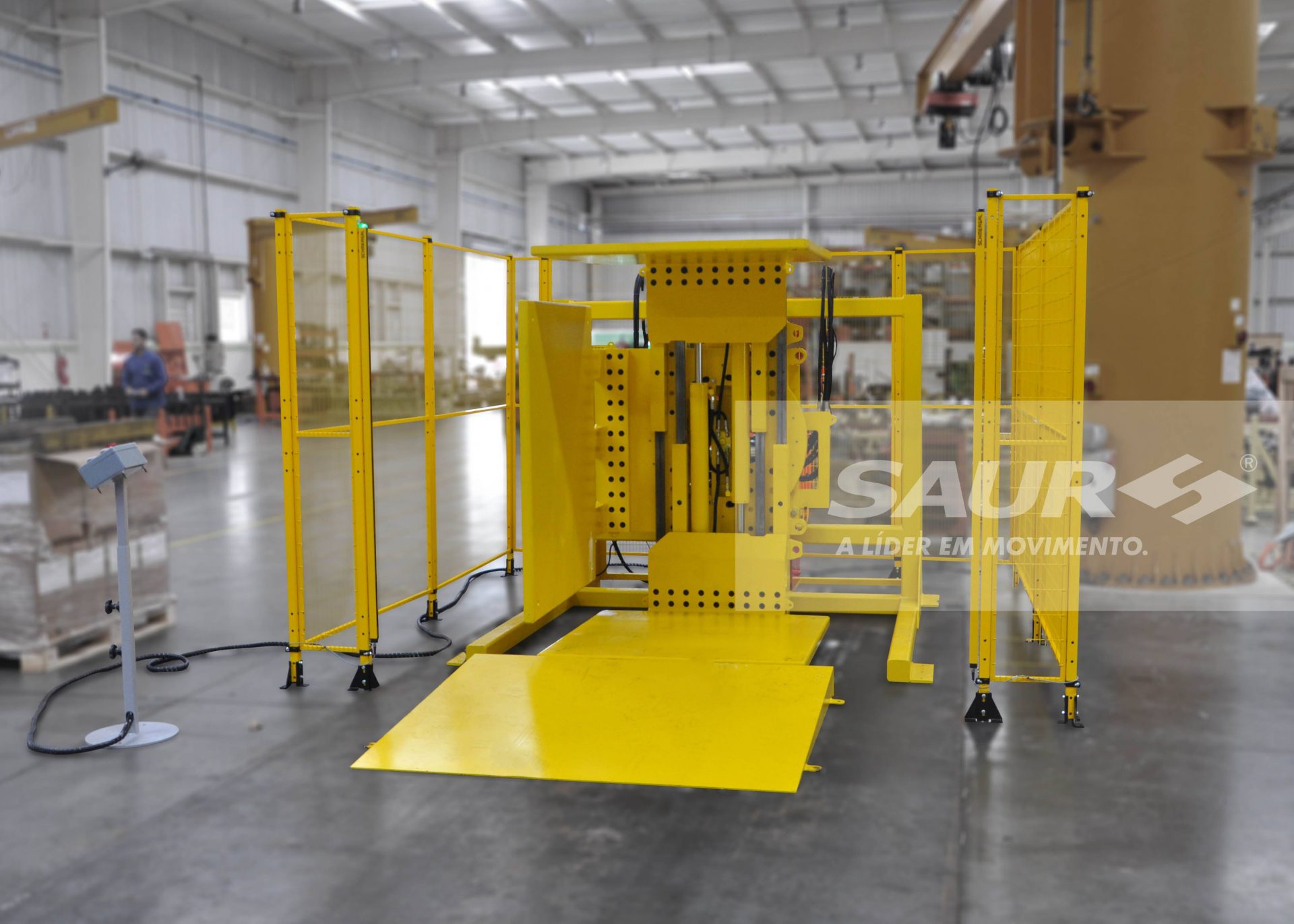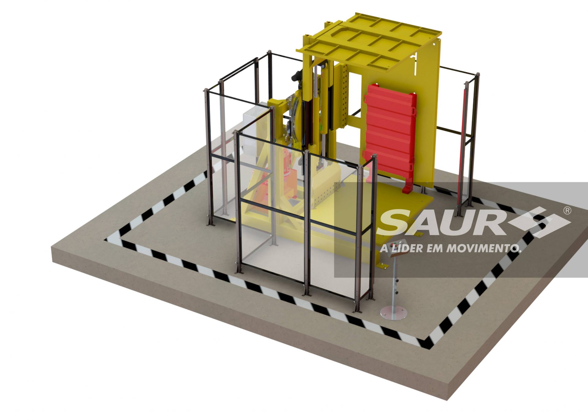 A Estação Inversora de Carga com Placas e Proteção Perimetral da SAUR é projetada para realizar a troca de paletes, transferindo carga de um palete para outro, como para paletes de plástico ou metálicos, evitando contaminação por madeira.
