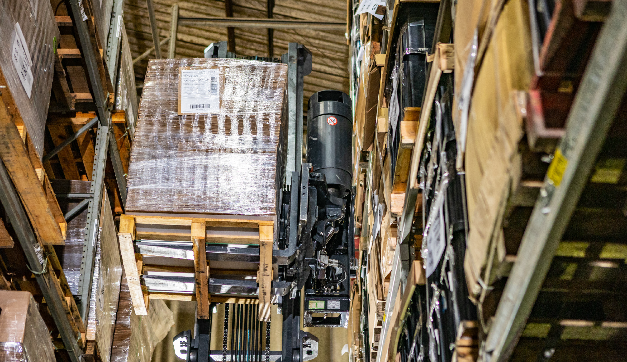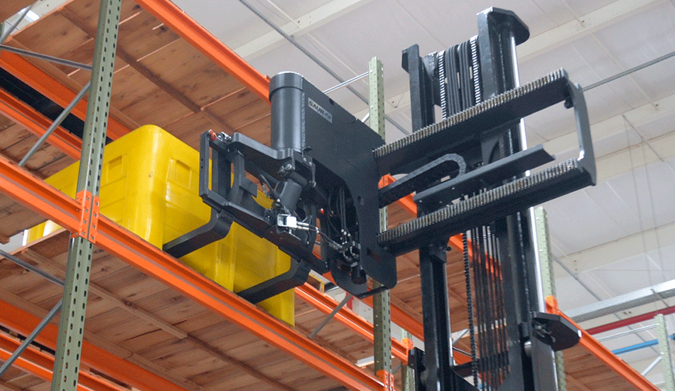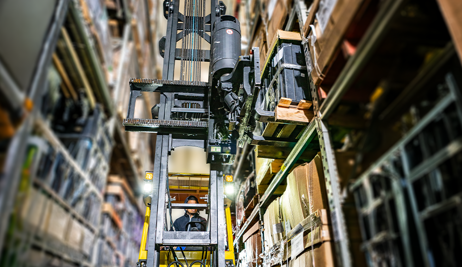 Operações eficientes em corredores estreitos e prateleiras de dupla profundidade.
