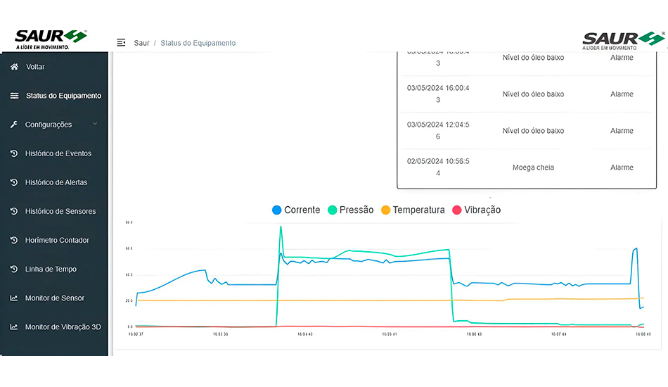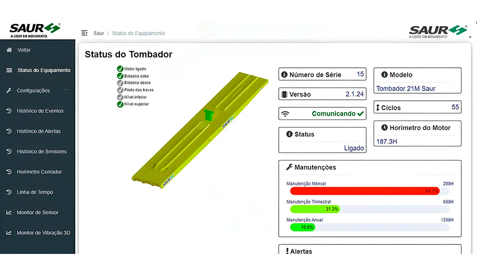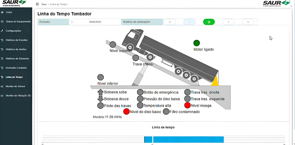 O Sistema de Telemetria da SAUR permite o monitoramento em tempo real de equipamentos como tombadores, utilizando sensores instalados na unidade hidráulica para coletar dados essenciais. Esse sistema avançado de telemetria analisa a temperatura de operação, pressão do sistema, vibrações do motor, nível de óleo e corrente elétrica, transmitindo todas essas informações para um portal online. Dessa forma, o operador pode acessar dados sobre o funcionamento do equipamento, identificar falhas, programar manutenções preventivas e otimizar a operação, evitando paradas inesperadas.