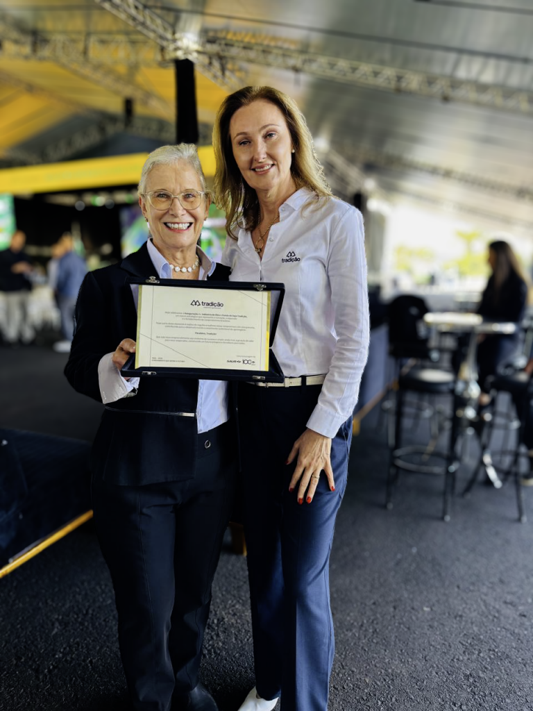 Durante esse momento especial, a presidente da SAUR, Ingrid Saur, realizou a entrega de uma placa em homenagem à Cooperativa, à Diretora de Governança, da Coopertradição, Mareli Linck Neitzke,reconhecendo sua trajetória de destaque no agronegócio e o importante investimento no setor industrial.