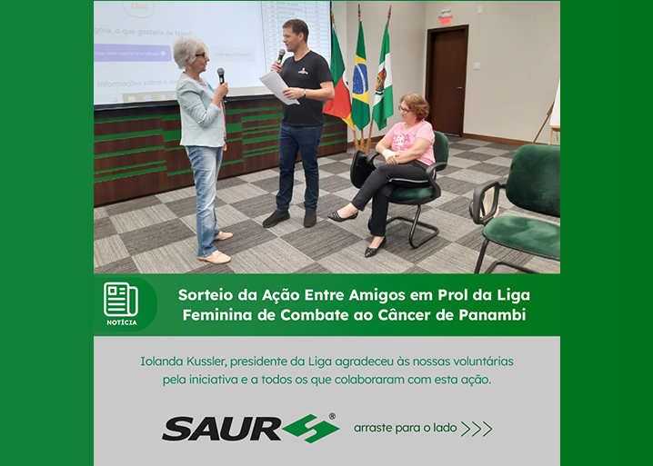 Contando com a presença de Iolanda Kussler e Jurema Schmidt, presidente e vice-presidente, respectivamente da Liga Feminina de Combate ao Câncer de Panambi, foi realizado o sorteio da Ação Entre Amigos promovida pelas Voluntárias da SAUR, em prol da entidade.