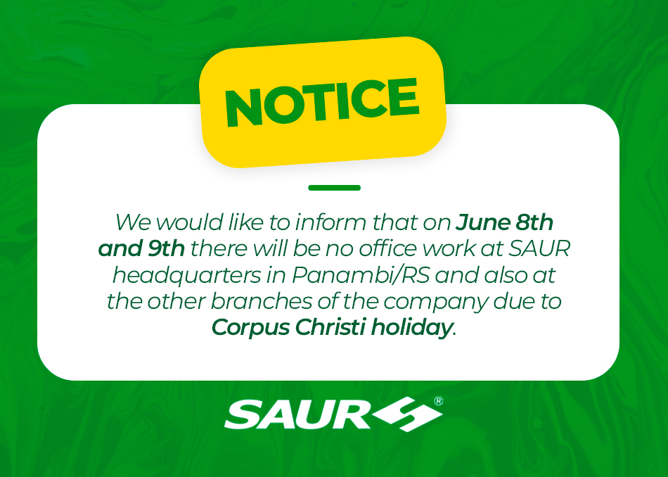 We would like to inform that on June 8th and 9th there will be no office work at SAUR headquarters in Panambi/RS and also at the other branches of the company due to Corpus Christi holiday, returning to normal activities on June 12th.