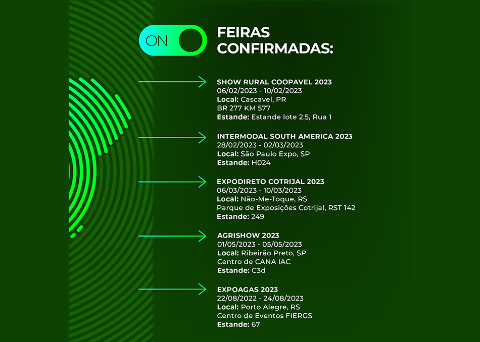 A primeira participação será na Show Rural Coopavel, em Cascavel – PR, uma das feiras mais importantes do agronegócio brasileiro. No final de fevereiro, estara em São Paulo, na Intermodal South América, considerado o maior evento de logística, intralogística, transporte de cargas e comércio exterior das Américas. Logo na sequência, estara em Não-Me-Toque – RS, na Expodireto, considerada uma das maiores feiras do agronegócio internacional. Em maio, estara na Agrishow, em Ribeirão Preto – SP, importante feira do agronegócio latino. E, em agosto, já confirma a presença na Expoagas 2023, em Porto Alegre – RS, principal feira gaúcha de supermercados.