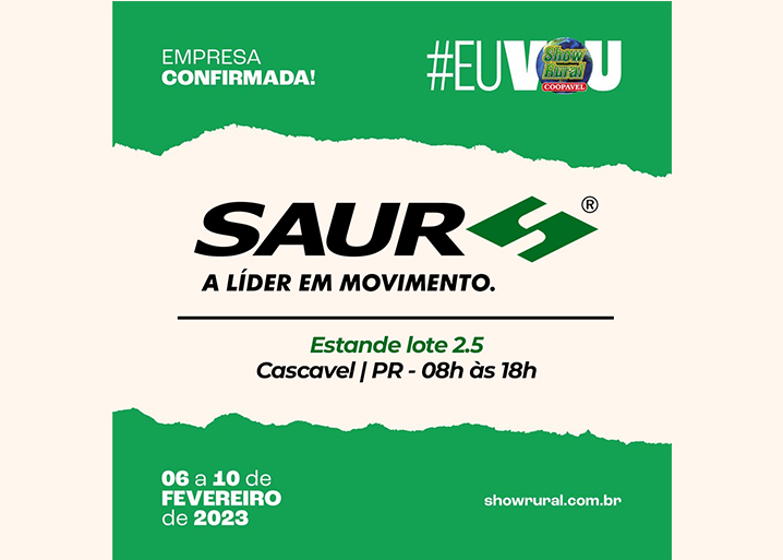 A Show Rural Coopavel é a primeira feira agropecuária do calendário nacional e recebeu quase 300 mil visitantes, conforme a administração do evento. Durante os cinco dias da feira, a SAUR esteve presente no lote 2.5, divulgando os equipamentos para esse segmento. Por meio da temática, a SOLUÇÃO COMPLETA PARA O RECEBIMENTO DE GRANÉIS, os equipamentos SAUR foram divulgados através de material promocional, bem como, os visitantes tiveram a oportunidade de conhecer pessoalmente um modelo de Garra Hidráulica para Fardos, que estava acoplada em uma empilhadeira do parceiro Petramaq.